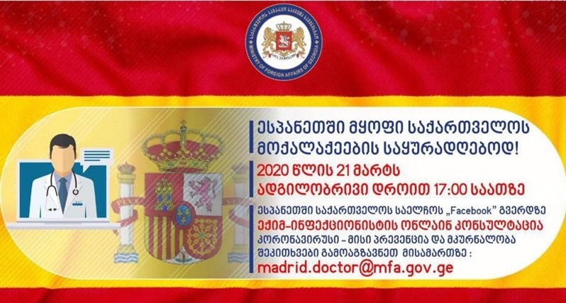 მიმდინარე წლის 21 მარტს, ესპანეთის დროით 17:00 საათზე, ესპანეთში საქართველოს საელჩოს Facebook გვერდზე თბილისიდან გაიმართება ექიმ-ინფექციონისტის ონლაინ კონსულტაცია ესპანეთში მყოფი თანამემამულეებისთვის თემაზე "კორონავირუსი - მისი პრევენცია და მკურნალობა". მოქალაქეებს შეკითხვები შეუძლიათ გააგზავნონ შემდეგ ელ-ფოსტაზე: madrid.doctor@mfa.gov.ge.