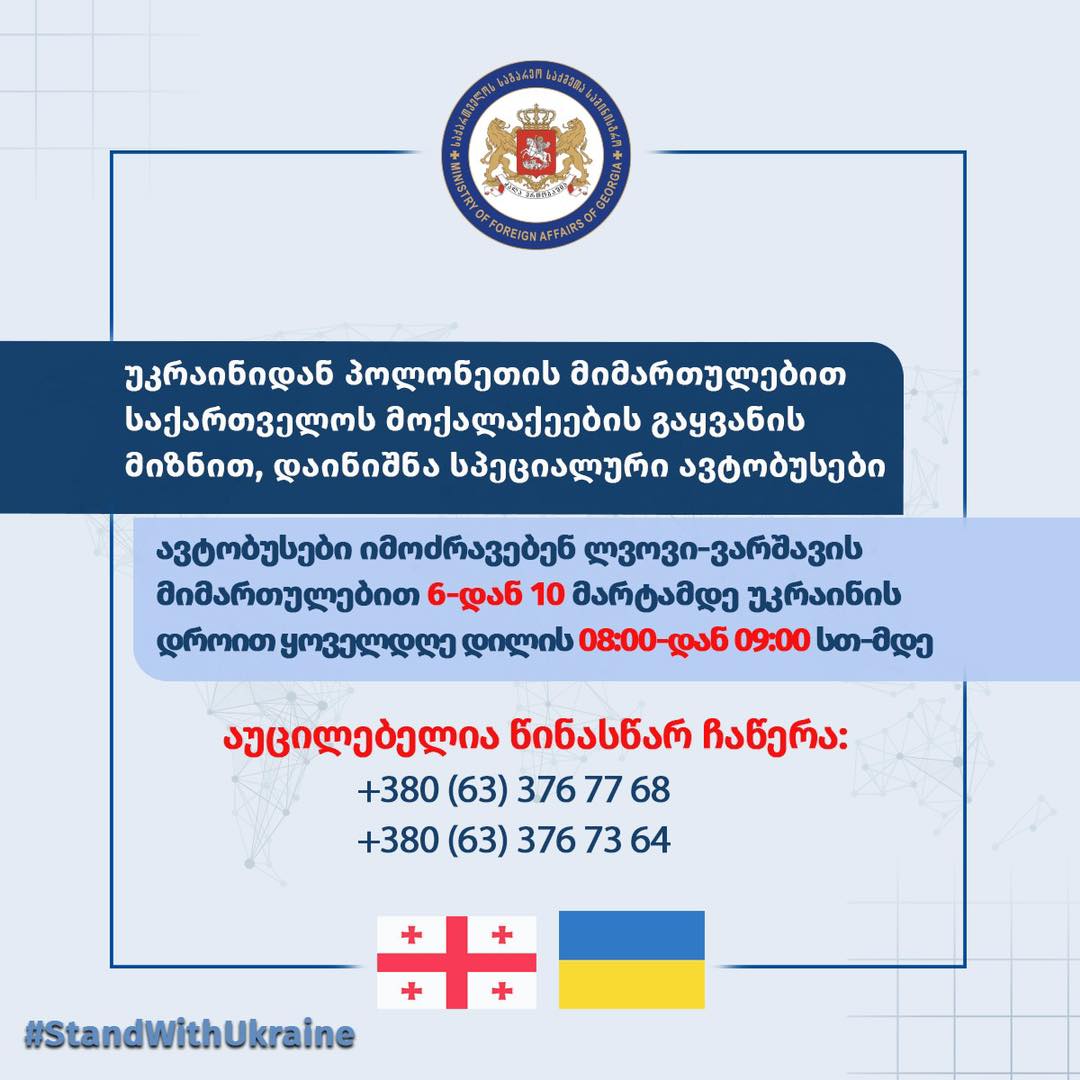 ავტობუსები ლვოვი-ვარშავის მიმართულებით იმოძრავებენ 6-დან 10 მარტამდე უკრაინის დროით ყოველდღე დილი...