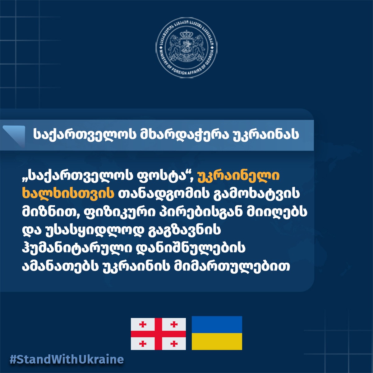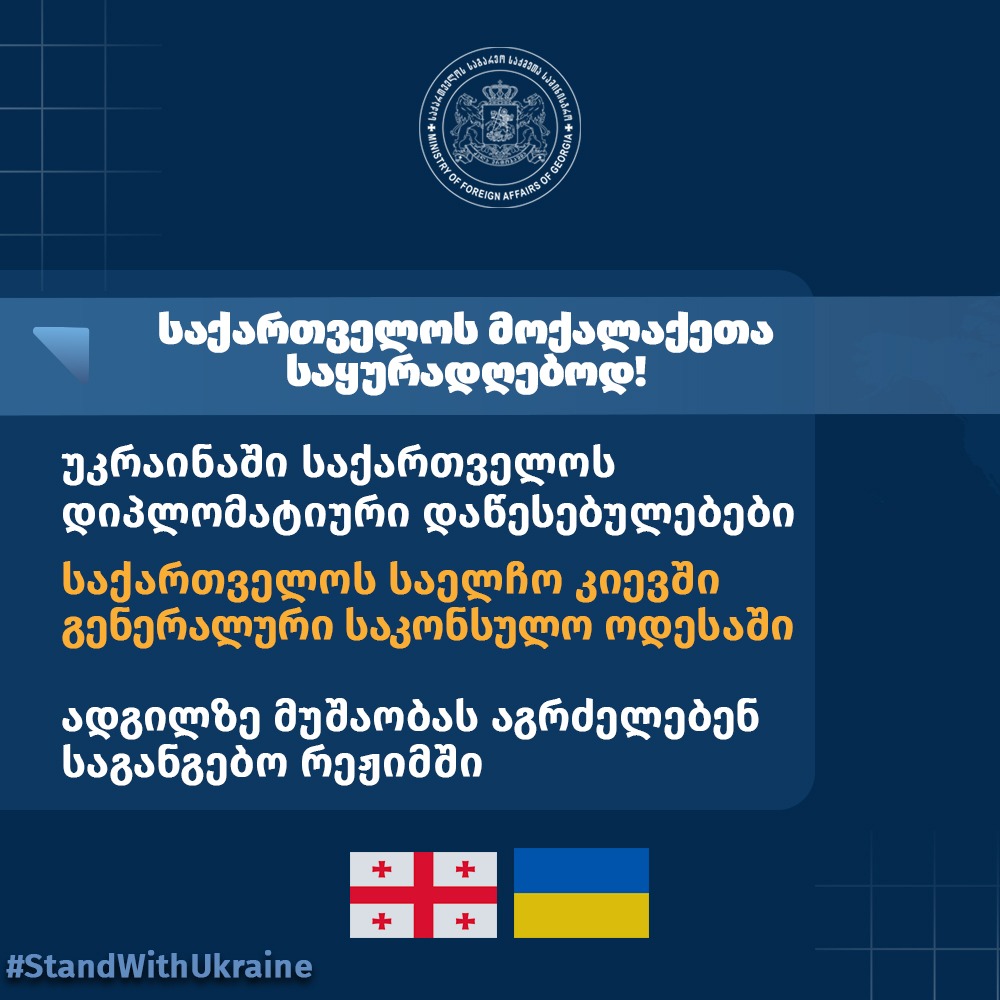 უკრაინის ტერიტორიაზე მყოფი საქართველოს მოქალქეებისთვის მოქმედებს ცხელი ხაზი +380 (63) 376 77 68;...