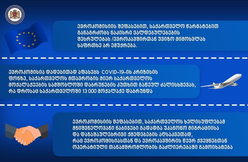 ევროკომისიის შეფასებით, საქართველოს ხელისუფლებამ მნიშვნელოვანი ნაბიჯები გადადგა საქართველოს მოქალაქეების უკანონო მიგრაციისა და დანაშაულებრივი ქმედებების აღსაკვეთად, რაც ევროკომისიასთან და ევროკავშირის წევრ ქვეყნებთან ოპერატიული თანამშრომლობის გაძლიერებაში გამოხატება.