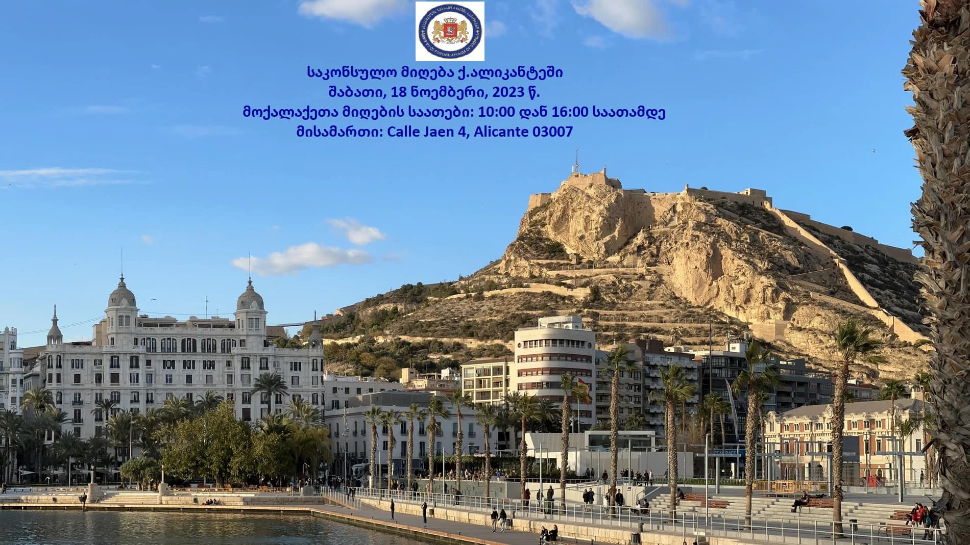 მიმდინარე წლის 18 ნოემბერს, საკონსულო ოლქის შემოვლის ფარგლებში იგეგმება ვალენსიის რეგიონის, ქალაქ ალიკანტეში მოქალაქეთა საკონსულო მიღება.