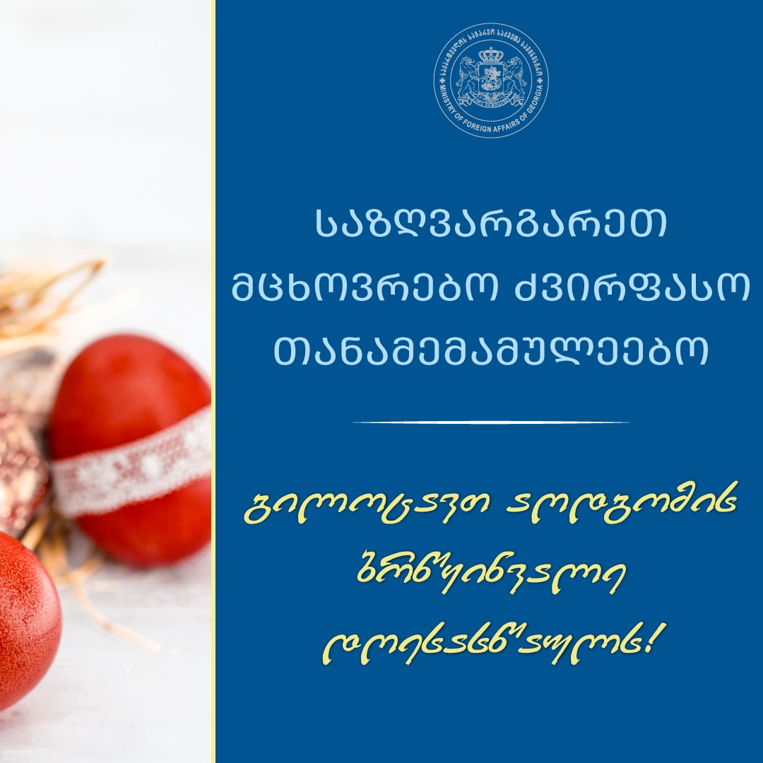 ვისურვებდი ყოველი თქვენგანისათვის და თქვენი ოჯახებისათვის აღდგომის ბრწყინვალე დღესასწაულს მოეტანოს ჯანმრთელობა, სულიერი სიძლიერე, უკეთესი მომავლის რწმენა. დაე ყოველ თქვენს კეთილ აზრსა და საქმეს მოჰყოლოდეს გამარჯვება და წარმატებები!“ - ილია დარჩიაშვილი, საგარეო საქმეთა მინისტრი.