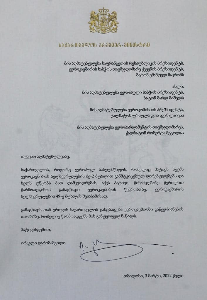 ევროკავშირის წევრობაზე განაცხადის გაკეთება კიდევ ერთი მნიშვნელოვანი ეტაპია საქართველოს ევროპული ინტეგრაციის გზაზე - ეტაპი, რომელიც ჩვენი ისტორიის ახალ ფურცელს შლის და აგრძელებს ჩვენი წინაპრების ძალისხმევას, რომელიც საერთო ევროპულ ოჯახში გაერთიანებისკენ იყო მიმართული.