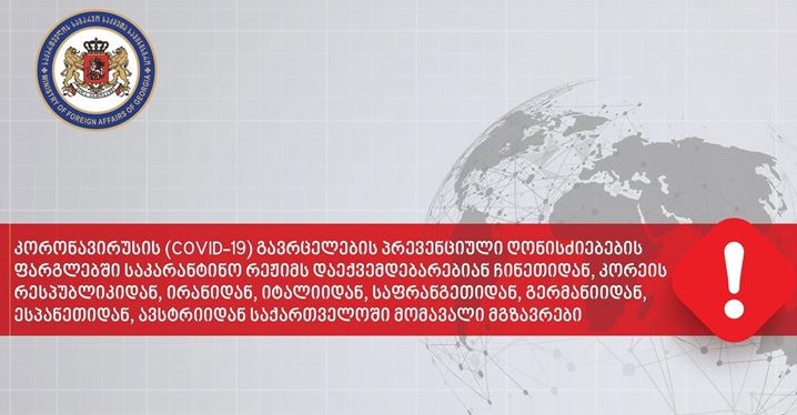 ამასთან, საქართველოს მოქალაქეებს ვთხოვთ გაითვალისწინონ, რომ ჩინეთის სახალხო რესპუბლიკაში, ირანის ისლამურ რესპუბლიკაში, იტალიის რესპუბლიკაში, კორეის რესპუბლიკაში, ესპანეთის სამეფოში, გერმანიის ფედერაციულ რესპუბლიკაში, ავსტრიის რესპუბლიკაში და საფრანგეთის რესპუბლიკაში მოგზაურობის ან ზემოხსენებულ ქვეყნებში ტრანზიტად ყოფნის შემთხვევაში, საქართველოში დაბრუნებისას ისინი ვალდებულნი არიან გაიარონ შესაბამისი ეპიდემიოლოგიური შემოწმება და შემდეგ სავალდებულო 14 დღიანი საკარანტინო პროცედურა ოკუპირებული ტერიტორიებიდან დევნილთა, შრომის, ჯანმრთელობისა და სოციალური დაცვის მინისტრის მიერ დადგენილი წესით.