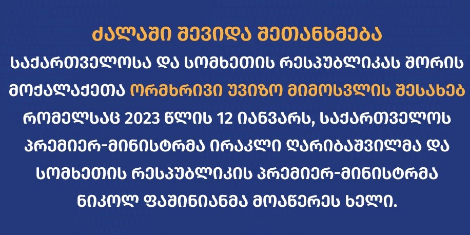 „საქართველოსა და სომხეთის რესპუბლიკას შორის მოქალაქეთა ორმხრივი უვიზო მიმოსვლის შესახებ“ შეთანხმება ძალაში შევიდა, რომელსაც საქართველოს პრემიერ-მინისტრის ირაკლი ღარიბაშვილისა და სომხეთის რესპუბლიკის პრემიერ-მინისტრის ნიკოლ ფაშინიანის მიერ, ხელი მოეწერა ქ. ერევანში, 2023 წლის 12 იანვარს.
