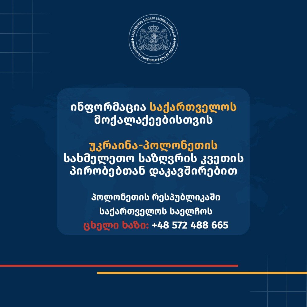 🇵🇱 პოლონეთში საქართველოს საელჩოს ცხელი ხაზის ნომერი ხელმისაწვდომია 24 საათის განმავლობაში:
