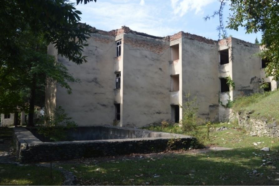 შენობის აღწერა: აღნიშნულ მიწის ნაკვეთზე მდებარეობს ყოფილი სამხედრო დანიშნულების 7 შენობა-ნაგებობა (საერთო ფართი - 1791 მ2) და აუზი (ფართი - 60 მ2); სართულების რაოდენობა I, II და III შენობაში - 3; ოთახების რაოდენობა I, II და III შენობაში ჯამურად - 75; ჭერის სიმაღლე I, II და III შენობაში - 3.6 მ. ტექნიკური მდგომარეობა: I, II და III შენობა ექვემდებარება რემონტს და რეაბილიტაციას, ხოლო დანარჩენი შენობები ექვემდებარება დემონტაჟს.