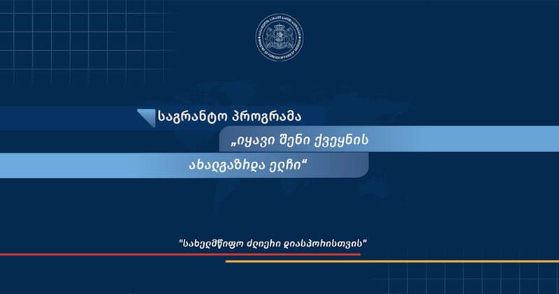 საქართველოს საგარეო საქმეთა სამინისტროს საგრანტო პროექტი -„იყავი შენი ქვეყნის ახალგაზრდა ელჩი“ ხორციელდება მიგრაციის პოლიტიკის განვითარების საერთაშორისო ცენტრის (ICMPD) მხარდაჭერით, ევროკავშირის მიერ დაფინანსებული პროექტის ENIGMMA 2-ის ფარგლებში.